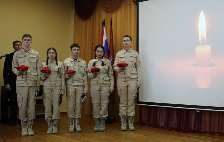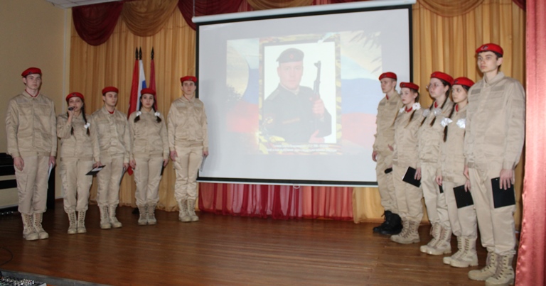 Самым трогательным моментом урока стал рассказ о десяти выпускниках школы, которым выпала доля – отдать свои жизни за мирное небо для грядущих поколений. Юнармейцы выстроились у экрана, с которого на умолкнувший зал один за другим смотрели наши парни, наша гордость и наша самая большая боль. Александр Сычёв, Сергей Голиков, Александр Терентьев, Максим Васильев, Владимир Шарипко, Андрей Жинжиков, Михаил Мотин, Евгений Фомченков, Вадим Гришин, Владимир Ушанов встали в ряды Бессмертного полка. Не верится, что такие молодые, сильные, мужественные, они уже не с нами. Но там, на небесах, бесстрашные бойцы стали ангелами-хранителями для своих родных, для всех нас.